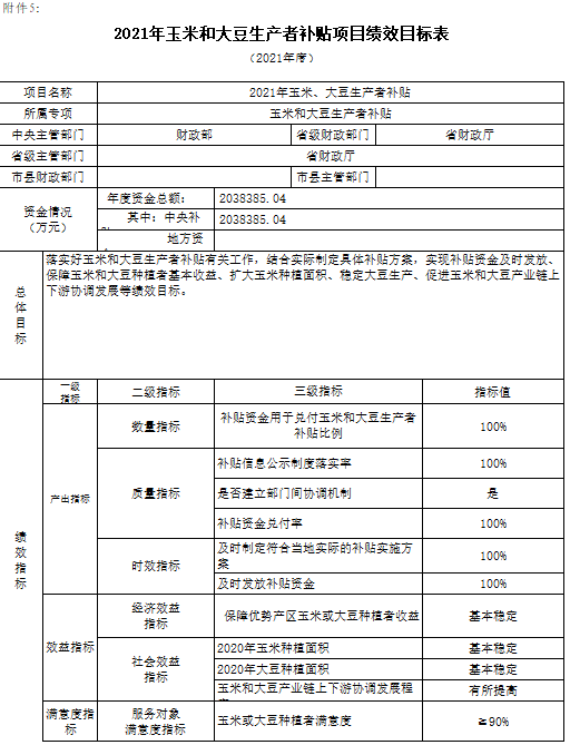 2021年大豆玉米和稻谷生產(chǎn)者補(bǔ)貼績效目標(biāo)表