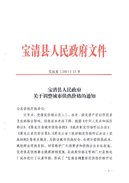 為了給廣大居民提供更加優(yōu)質(zhì)的服務,規(guī)范企業(yè)行為,現(xiàn)將縣政府調(diào)整寶清縣城市供熱價格文件,以及寶清瑞亨通熱力有限公司(原寶清縣熱電廠)供熱價格收費公示制度、投訴電話公開如下: