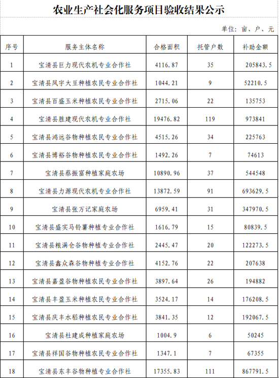 根據(jù)《關(guān)于印發(fā)黑龍江省2023年農(nóng)業(yè)生產(chǎn)社會(huì)化服務(wù)項(xiàng)目實(shí)施方案的通知》(黑農(nóng)廳發(fā)﹝2023﹞291號(hào))、《關(guān)于印發(fā)2023年雙鴨山市農(nóng)業(yè)生產(chǎn)社會(huì)化服務(wù)項(xiàng)目驗(yàn)收方案的通知》及縣農(nóng)業(yè)農(nóng)村局制定下發(fā)的《關(guān)于印發(fā)寶清縣2023年農(nóng)業(yè)生產(chǎn)社會(huì)化服務(wù)項(xiàng)目實(shí)施方案的通知》(寶農(nóng)發(fā)﹝2023﹞85號(hào))、《關(guān)于印發(fā)寶清縣2023年農(nóng)業(yè)生產(chǎn)社會(huì)化服務(wù)項(xiàng)目驗(yàn)收方案的通知》(寶農(nóng)發(fā)﹝2023﹞111號(hào))等文件要求,經(jīng)過鄉(xiāng)鎮(zhèn)初驗(yàn)、縣級(jí)復(fù)驗(yàn)、市級(jí)抽驗(yàn),最終確定有18個(gè)服務(wù)組織開展的農(nóng)業(yè)生產(chǎn)社會(huì)化服務(wù)項(xiàng)目通過驗(yàn)收。現(xiàn)將驗(yàn)收結(jié)果公示如下: