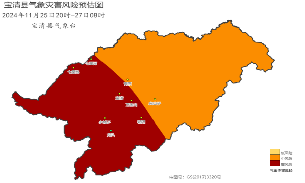 圖3:寶清縣2024年11月25日20時(shí)-27日08時(shí)氣象災(zāi)害綜合風(fēng)險(xiǎn)預(yù)估圖