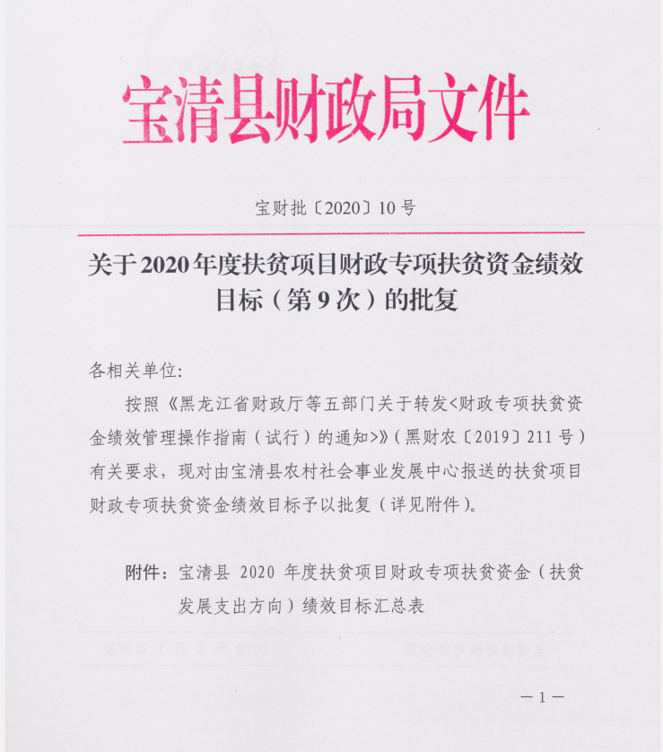 關(guān)于2020年度扶貧項目財政專項扶貧資金績效目標(biāo)(第9次)的批復(fù)