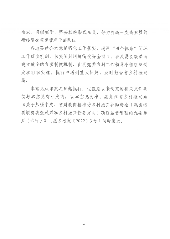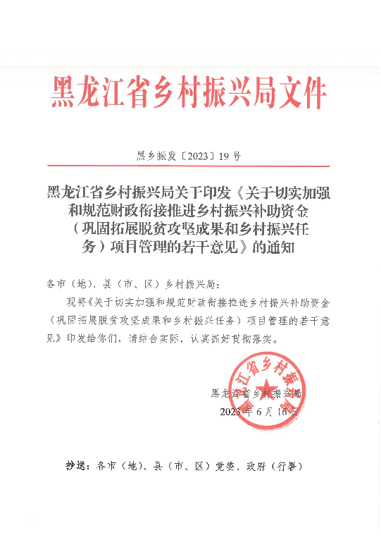 黑龍江省鄉(xiāng)村振興局關(guān)于印發(fā)《關(guān)于切實(shí)加強(qiáng)和規(guī)范財(cái)政銜接推進(jìn)鄉(xiāng)村振興補(bǔ)助資金(鞏固拓展脫貧攻堅(jiān)成果和鄉(xiāng)村振興任務(wù))項(xiàng)目管理的若干意見(jiàn)》的通知